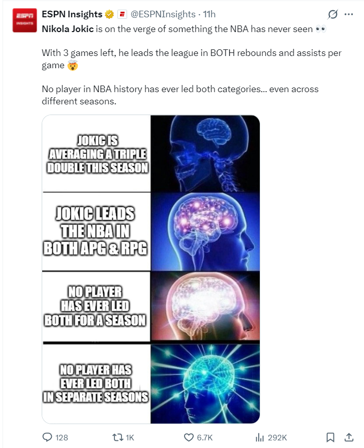 这场比赛之前ESPN就晒出了约基奇又一盖世伟业,他又将创造一项NBA从未有过的历史性成就,他提前三场比赛就在篮板、助攻两项数据上锁定联盟第一,这太不可思议了。除了约基奇之外,NBA历史上从未有过球员能提前三场比赛在篮板、助攻两项数据上提前锁定联盟第一的。